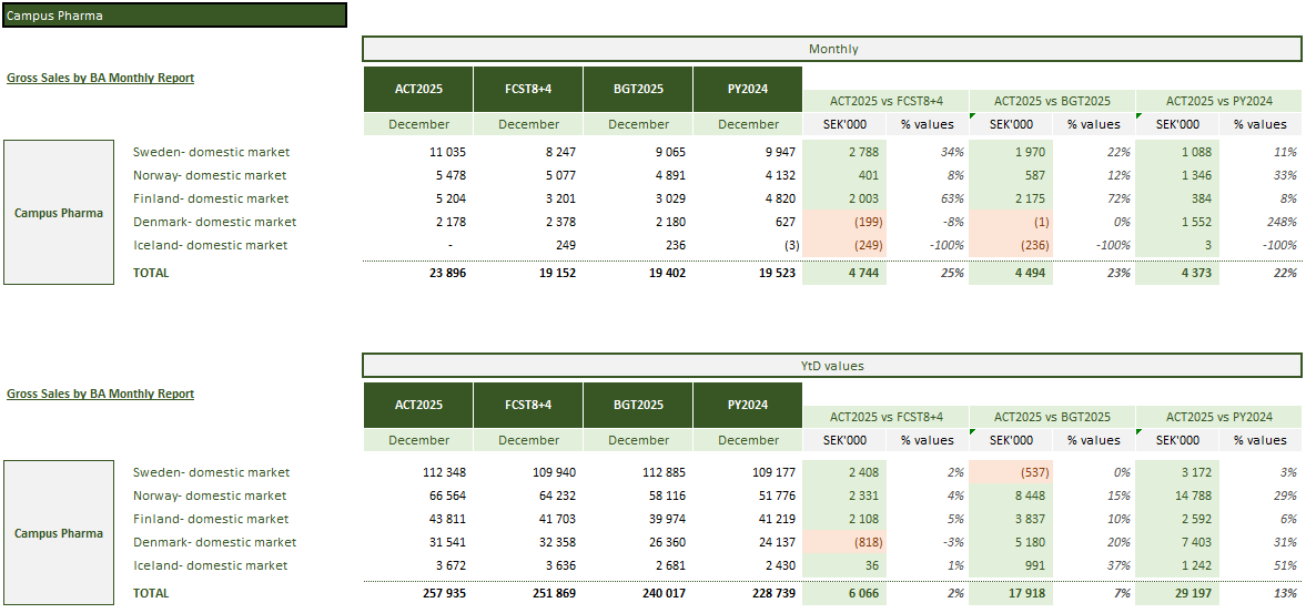 I december fakturerade Campus ut för TSEK 23 896 vilket är 4494 över budget och 4744 över senaste prognos. Core +226…