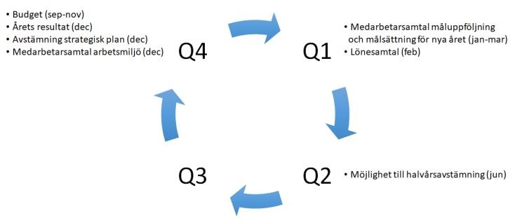 Varje år genomförs personliga medarbetarsamtal med varje anställd. Närmaste chef ansvarar för att samtalet genomförs och att det dokumenteras. CampusPharma arbetar utifrån ett årsvarv där olika saker gås igenom under olika delar av året (se figur nedan).