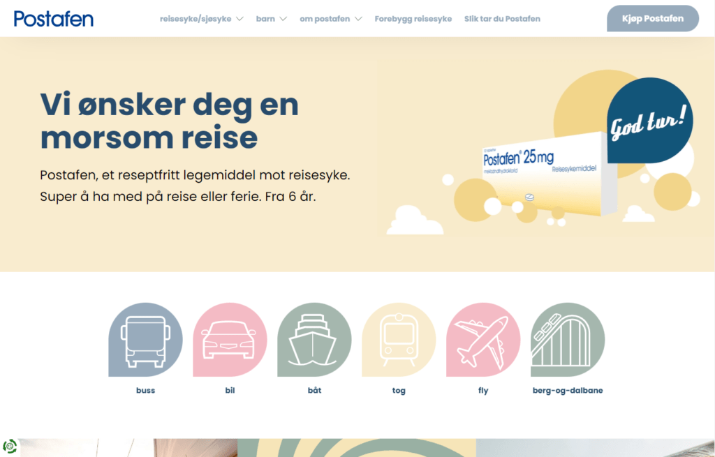 Reisesyketabletten Postafen er et reseptfritt legemiddel mot reisesyke, som selges på apoteket. Voksne og barn over 12 år kan ta én tablett, og barn mellom 6 og 12 år tar en halv tablett. Tabletten skal tas en time før reisen og gir lindring gjennom 12 timer. Hvis reisen pågår lenger enn 12 timer, tar du en ny tablett etter 12 timer. Voksne må ta maks to tabletter per døgn og barn maks to halve tabletter per døgn.