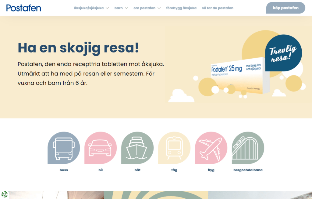 Postafen 25 mg är en tablett innehållande meklozin. Det är ett receptfritt läkemedel mot rörelsesjuka för vuxna och barn från 6 år. Postafen kan orsaka trötthet och därför påverka reaktionsförmågan så iaktta försiktighet vid bilkörning och användning av maskiner.