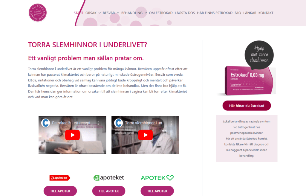 Torra slemhinnor i underlivet är ett vanligt problem för många kvinnor. Besvären uppstår oftast efter att kvinnan har passerat klimakteriet och beror på naturligt minskade östrogennivåer. Besvär som sveda, klåda, irritationer och obehag vid samlag kan vara jobbigt både kroppsligt och mentalt och påverkar livskvalitén negativt. Besvären är oftast bestående om de inte behandlas. Men det finns bra hjälp att få. Den här hemsidan ger information om orsaken till att slemhinnan i vagina kan bli torr efter klimakteriet och vad man kan göra åt det.