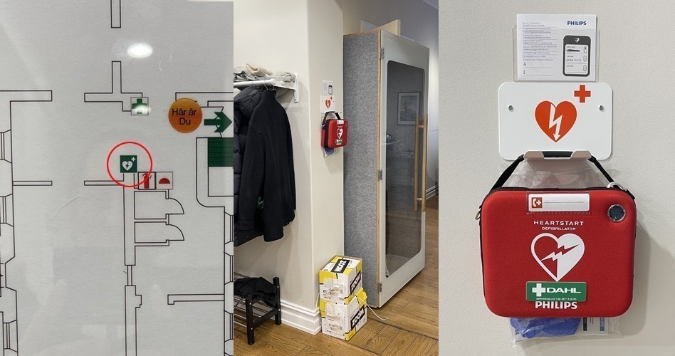 Vid entrén på kontoret, till höger när man kommer in, så hänger det en skylt med anvisning om vart, vilken adress. Samt var vi har nödutgångar.