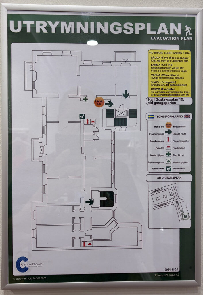 Återsamlingsplats vid utrymning är utanför vårt garage på Karl Gustavsgatan 12.